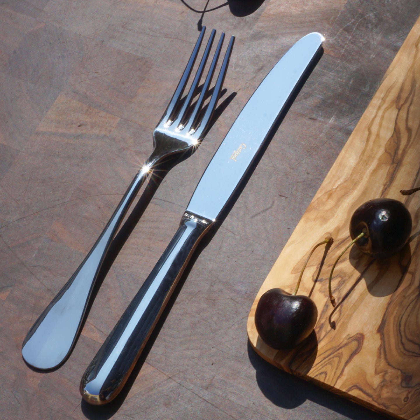 Founded in 1963, Cutipol is a family-run company that specialises in cutlery with sober, fine lines that are pleasant to the touch. Each piece is handmade in Portugal, which allows for great attention to detail and quality control. The Baguette collection has curved, drop-shaped ends, with an almost imperceptible line going through the middle of the handle to emphasise its symmetry. It is suitable for both everyday use and larger parties. The knives in this set have European-style hollow handles, which are lighter to hold and well-balanced with the blade. All pieces are dishwasher-safe, and keep their shine even after many years of use. This set includes: