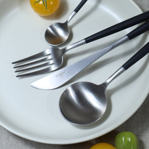 Founded in 1963, Cutipol is a family-run company that specialises in cutlery with sober, fine lines that are pleasant to the touch. Each piece is handmade in Portugal, which allows for great attention to detail and quality control. The Goa range is their most recognisable; inspired by paintbrushes, it is a balance of Eastern and Western culinary design. Every piece is made of 18/10 brushed stainless steel; it is resistant to rust, scratches and fading. The collection has sleek handles that look and feel like wood, but are made from resin—making this set dishwasher-safe. (However, it is best to minimise contact with dishwasher steam by removing it as soon as the cycle ends.) The resin also looks good as new when rubbed with a few drops of food-safe oil. This 75-piece set includes: