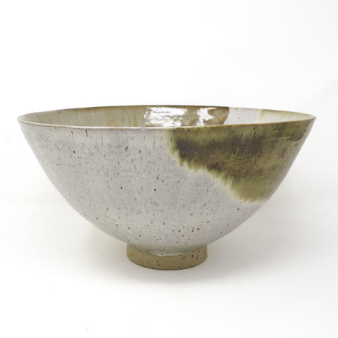 Flecked stoneware clay, clay slip and oxide brushstroke decoration, shiny off-white glaze |