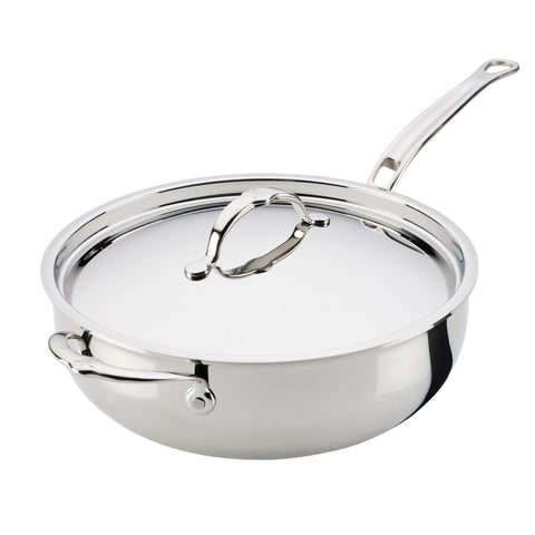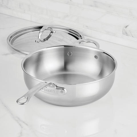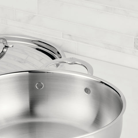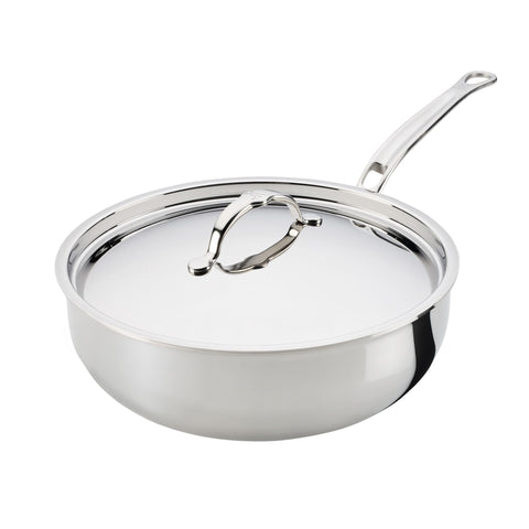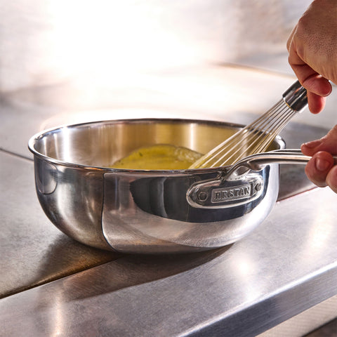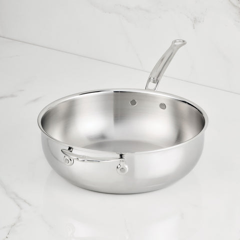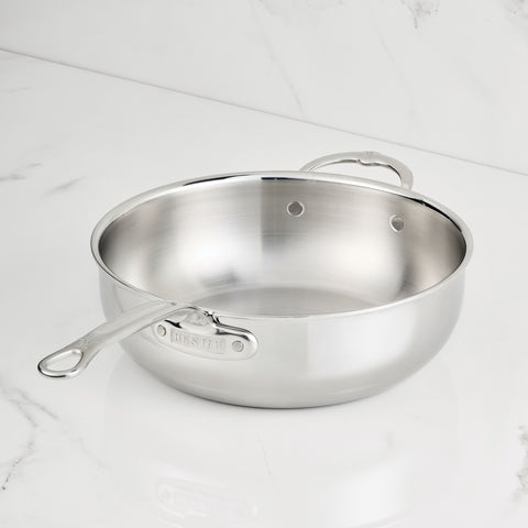 Pans in Hestan's Probond Luxe range are premium tri-ply stainless steel cookware. Made in Italy, they feature three layers of metal, with a thick core of aluminium that makes heat conductivity 35% faster than most other tri-ply pans. Built to withstand temperatures up to 316ºC, these pans are oven and grill-safe and induction-compatible, making it easy to transfer from stove to oven. The ergonomic handles feature a vent that keeps them comparatively cool on the hob, and are seamlessly joined to the pan to eliminate a crevice where dirt can get trapped. This Essential Pan, also known as a curved splayed saute pan, or saucier, is a great all-purpose pan. The versatile size and curved shape of the pan make it great for sautéing, frying, and reducing liquids, making it an ideal pan for cooking stews, risottos, curries, and sauces and more. The mirror-polished finish makes it easy to clean but also makes it ideal as an oven-to-table piece.