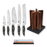 Every knife in Kai Shun’s Nagare range undergoes a highly sophisticated process which involves bonding flexible VG2 steel with hard VG10 steel, surrounded by 72 layers of Damascus steel that form a radial pattern. Besides looking beautiful, this construction provides excellent durability and prevents food from sticking to the sides of the blade as you prep food. Very little pressure is required to make neat and precise cuts, and the blades retain their sharp edges for long stretches of time. The waterproof handle adopts the ergonomic style of Western knives, with a forged tang that provides an optimum counterweight to the blade. Japanese knives should only be sharpened with a whetstone, as pull-through sharpeners can damage their metal. The included Kai Stonehenge Walnut Knife Block has an ultra-stable granite base and can hold up to ten knives or metal utensils.