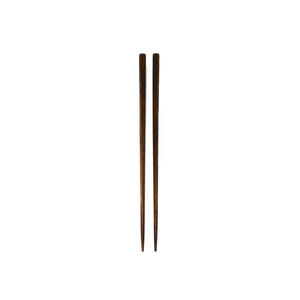 These chopsticks made from persimmon wood feature an octagonal shape that sits well in the hand. Square tips make it easy to grasp noodles and other foods. The black rests are handmade of glazed pottery.