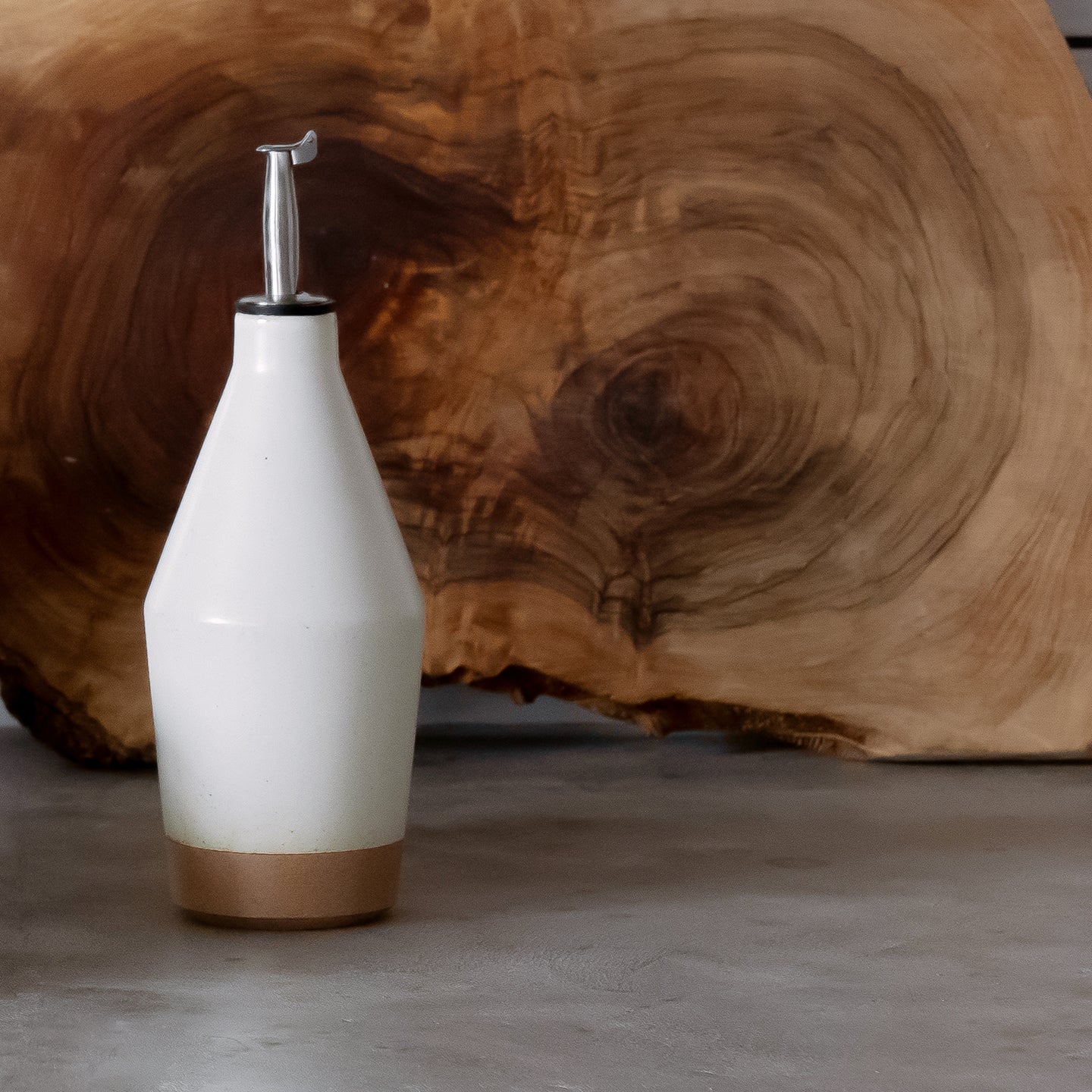 Kinto’s Ceramic Lab range balances orderly, neat design with the warm patterns of sandstone native to the Nagasaki prefecture of Japan, where it is manufactured. Many transformations occur in this unique porcelain, which is ultra-sensitive to temperature and humidity when firing. This results in a speckled, ‘scorched’-looking pattern called 'yo-hen'. The natural unevenness of this effect is balanced by orderly, neat shapes and a sharp delineation between the textured bottom and smooth sides. This oil bottle is great for using by the hob or at the table; it can be used to store vinegar as well.
