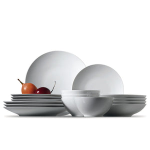 Loft is a collaboration between two titans of the ceramics industry: Rosenthal, the 140-year-old German porcelain manufacturer, and award-winning British design group Queensberry Hunt, whose work is in many museum collections worldwide including London’s Victoria & Albert. Every piece is made from high-fired vitrified white porcelain resulting in a glossy sheen, scratch-resistance and exceptional durability, even after a decade of use. It is dishwasher- and microwave-compatible. Subtle, lightly embossed concentric circles extend from the centre to the edge of each plate (the bowl features the pattern on the exterior but is plain on the interior), a fresh take on classic white tableware. This 16-piece set includes:
