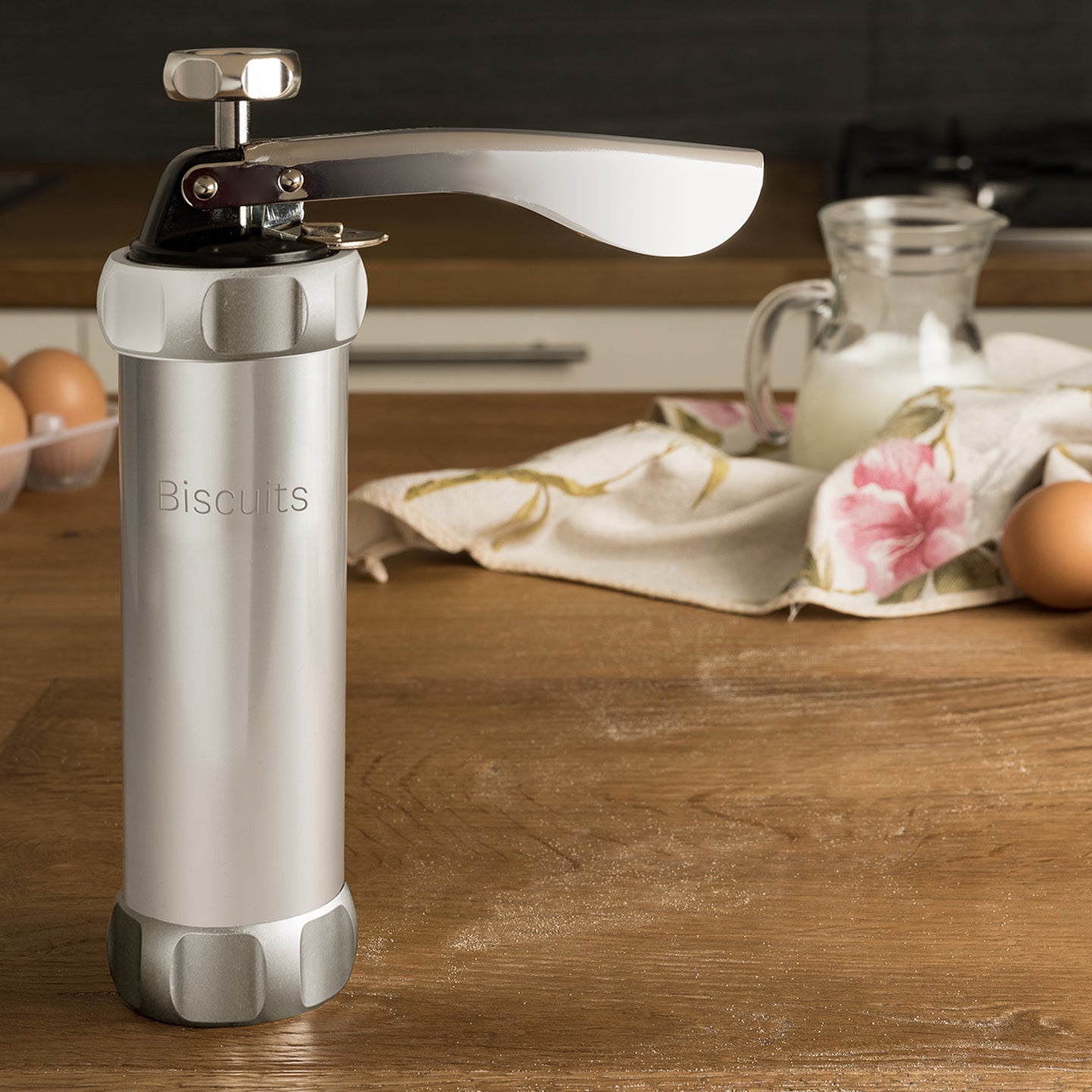 This Marcato Biscuit Press allows you to prepare 20 different styles of biscuit with delightful ease. One fill of biscuit dough in the cylinder will make 35-40 small biscuits and up to 20-25 large ones. To use, just place the end of the cylinder onto your baking tray, pull down the lever, lift the cylinder, and the biscuit shape you have pre-set will be there, ready to bake. The ergonomic handle of the lever is easy to grip and enables you to work effortlessly with different types of dough.