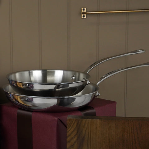 Mauviel’s M’Cook range outperforms standard stainless steel pans by miles. Every pan in this range has an inner layer of 18/10 stainless steel and an outer layer of ferritic stainless steel, which makes it induction-compatible, plus three layers of heat-responsive aluminium. The middle layer of that aluminium is pure, meaning there is no adhesive agent in it that slightly weakens its power. Unlike many pans which only have heat-conducting metal like aluminium just at the base, this pan has aluminium all along the sides and to the edge, meaning your food will cook faster and more evenly. High-quality, scratch-resistant steel that’s polished on the outside but brushed on the inside. This set features a 24cm and a 28cm stainless steel frying pan; both are oven-compatible.