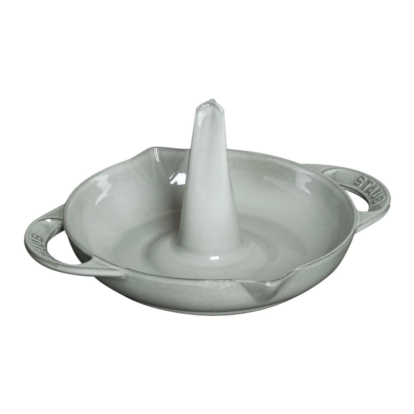The Staub Cast Iron Vertical Chicken Roaster comes from their exceptional cast iron cookware collection, which was designed to compliment their iconic range of cocottes. With matte enamel on the interior, the ingenious spike in the roaster means poultry is cooked impeccably evenly. Staub have enhanced the natural, heat retaining qualities of cast iron, meaning heat is distributed efficiently, evenly and gradually, so flavours and aromas are retained. This incredible cast iron is also extremely heavy duty, will not warp or rust, and can be used on most heat surfaces. As well as providing a stunning performance, the pan also looks great in the kitchen, and, due to its classic style handles, can be moved straight from the oven to the table. Used by professionals worldwide but just as suitable for home cooks.